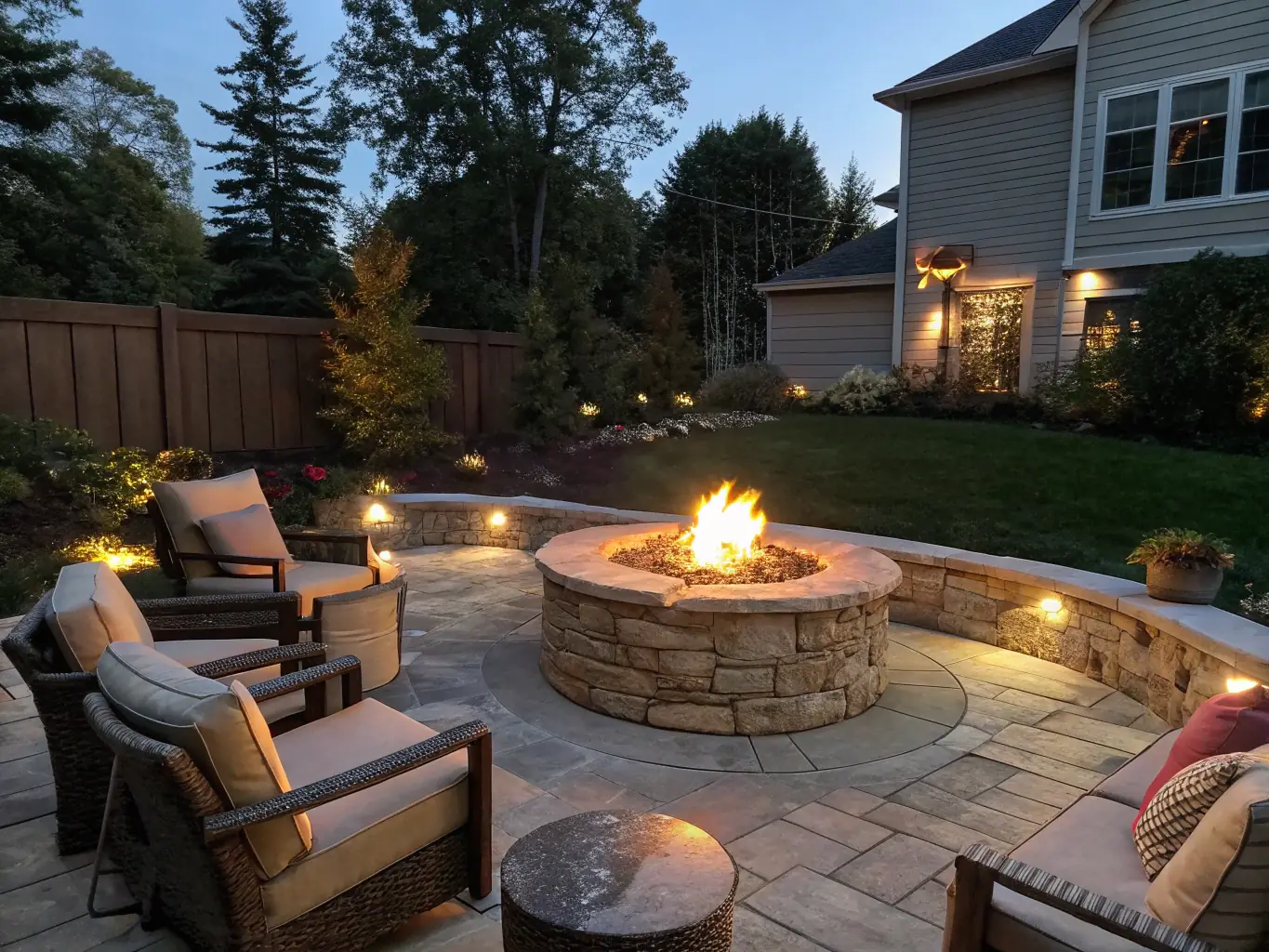 - Backyard Retreat with Stamped Concrete: A backyard area with a fire pit and seating, ideal for gatherings.